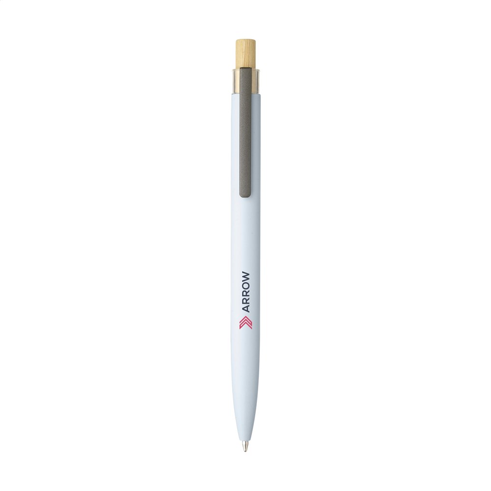 Modieuze, blauwschrijvende balpen met een houder van 100% gerecycled aluminium, afgewerkt met een matte finish. De bamboe drukknop heeft een transparant accent. De houder bestaat uit één geheel en is standaard bedrukt met het 'recycled aluminium logo'. GRS-gecertificeerd. Door het gebruik van gerecycled aluminium worden er minder nieuwe grondstoffen gebruikt tijdens de productie van dit product. Dit betekent minder energieverbruik en minder gebruik van water.