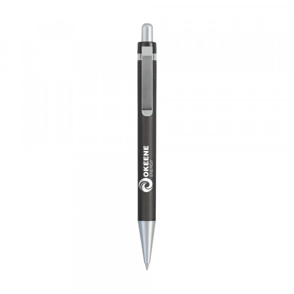 Blauwschrijvende balpen met transparantgekleurde houder en matmetalen clip.