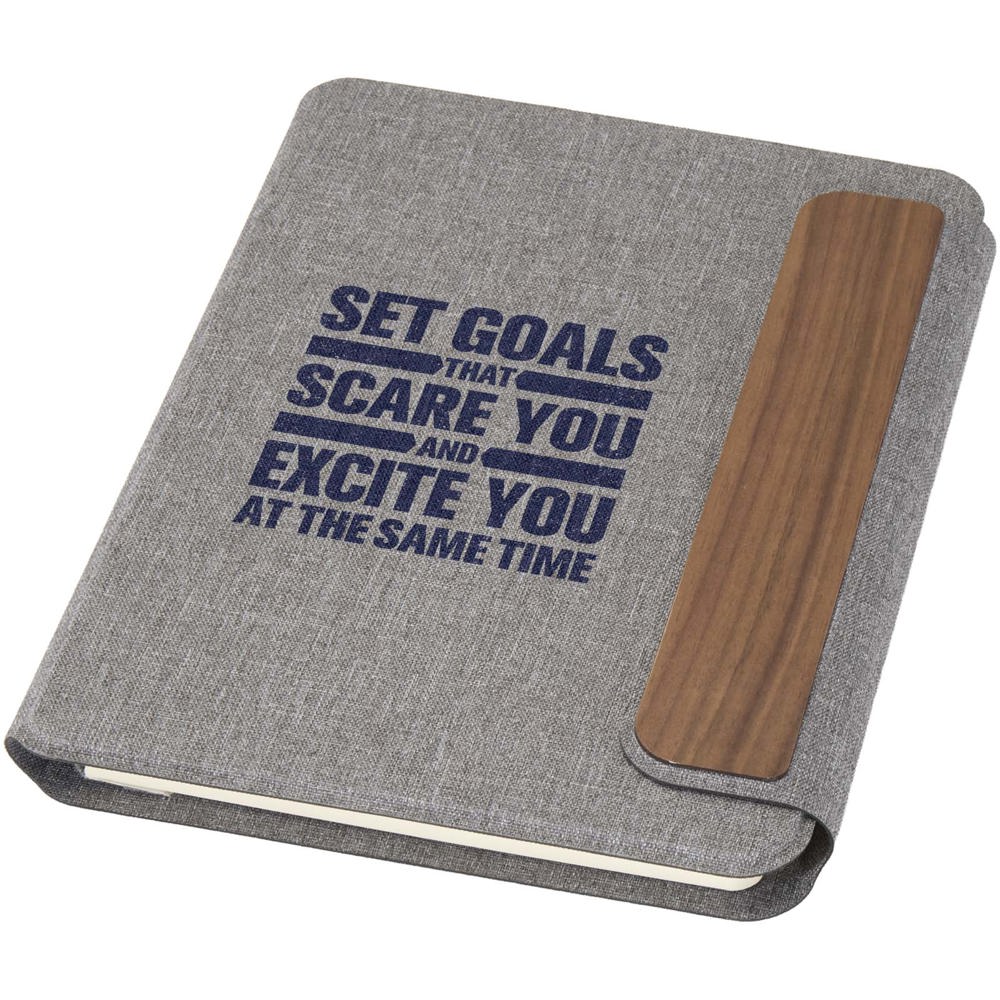 De Andean A5-portfolio is gedeeltelijk gemaakt van RCS-gecertificeerd gerecycled post-consumer polyester, wat een duurzamer alternatief biedt door de afhankelijkheid van nieuwe materialen te verminderen. De portfolio is ontworpen met een slanke grijze harde kaft met afgeronde hoeken en nauwkeurig gelaste technologie en beveiligd met een magnetische sluiting geaccentueerd door een verfijnde walnoothouten detail voor een modern en verfijnd tintje. Binnenin vind je een verwijderbaar notitieboek met zachte kaft en 64 crèmekleurige gelinieerde vellen, gemaakt van 80 g/m² papier van verantwoorde herkomst. Gepresenteerd in een kraft-kleurige papieren hoes.
