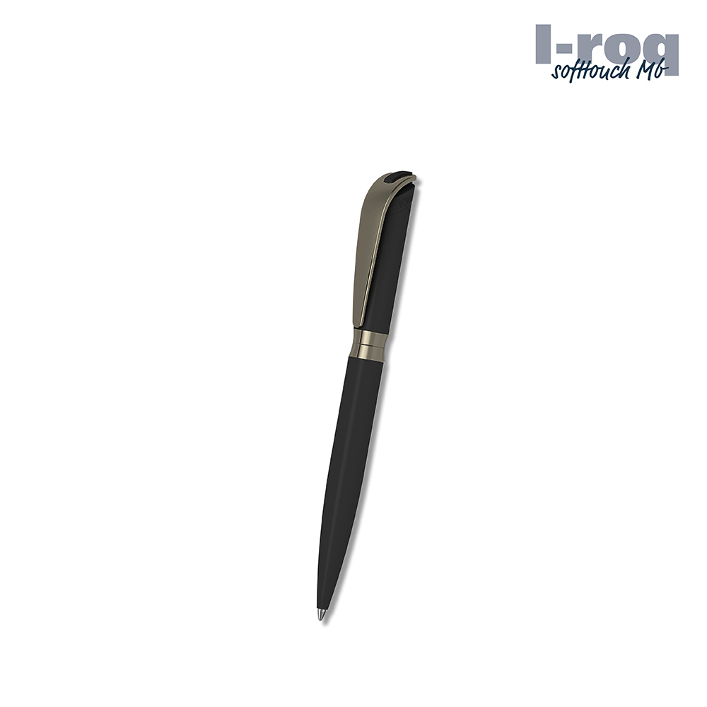 De I-roq softtouch Mb is een Draaibalpen. Materialen en oppervlakken: Schacht: Messing, met rubber softtouch oppervlak. Ring: Messing gepolijst. Bovendeel: Messing, met rubber softtouch oppervlak. Clip: Verenstaal gepolijst. Standaard kleuren: Schacht en bovendeel: zwart. : vanaf 10.000 stuks; vanaf 25.000 stuks zonder PMS-toeslag. Standaard vulling: Multifill P (8 000 m), blauw, vulling optioneel: Multifill P (zwart).