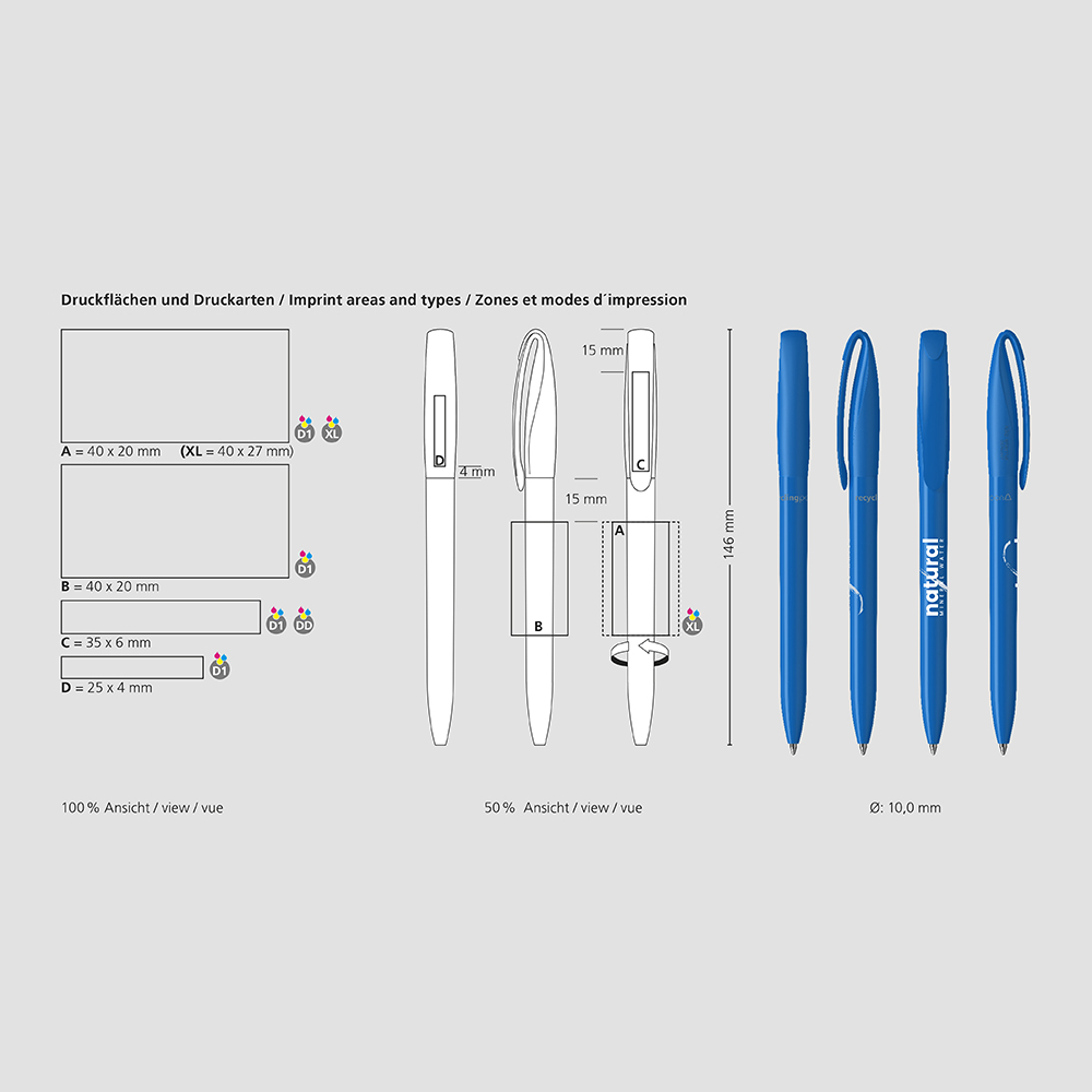 De Boa recycling is een Draaibalpen. Materialen en oppervlakken: Schacht en bovendeel: Kunststof (rABS) hoogglanzend, gerecycled. Bovendeel: Mix van matte en glanzende oppervlakken. Navulbuis: Gerecycled polypropyleen (rPP). Standaard kleuren: Schacht en bovendeel: te combineren uit 14 kleuren. Opmerking: Doordat gebruik wordt gemaakt van gerecyclede grondstoffen, kunnen zelfs in afzonderlijke onderdelen van een product kleurafwijkingen voorkomen. : vanaf 3000 stuks; vanaf 25.000 stuks zonder PMS-toeslag. Standaard vulling: Silktech L (3 000 m), blauw of zwart, vulling optioneel: Silktech XL, Multifill P, Multi-Gel.