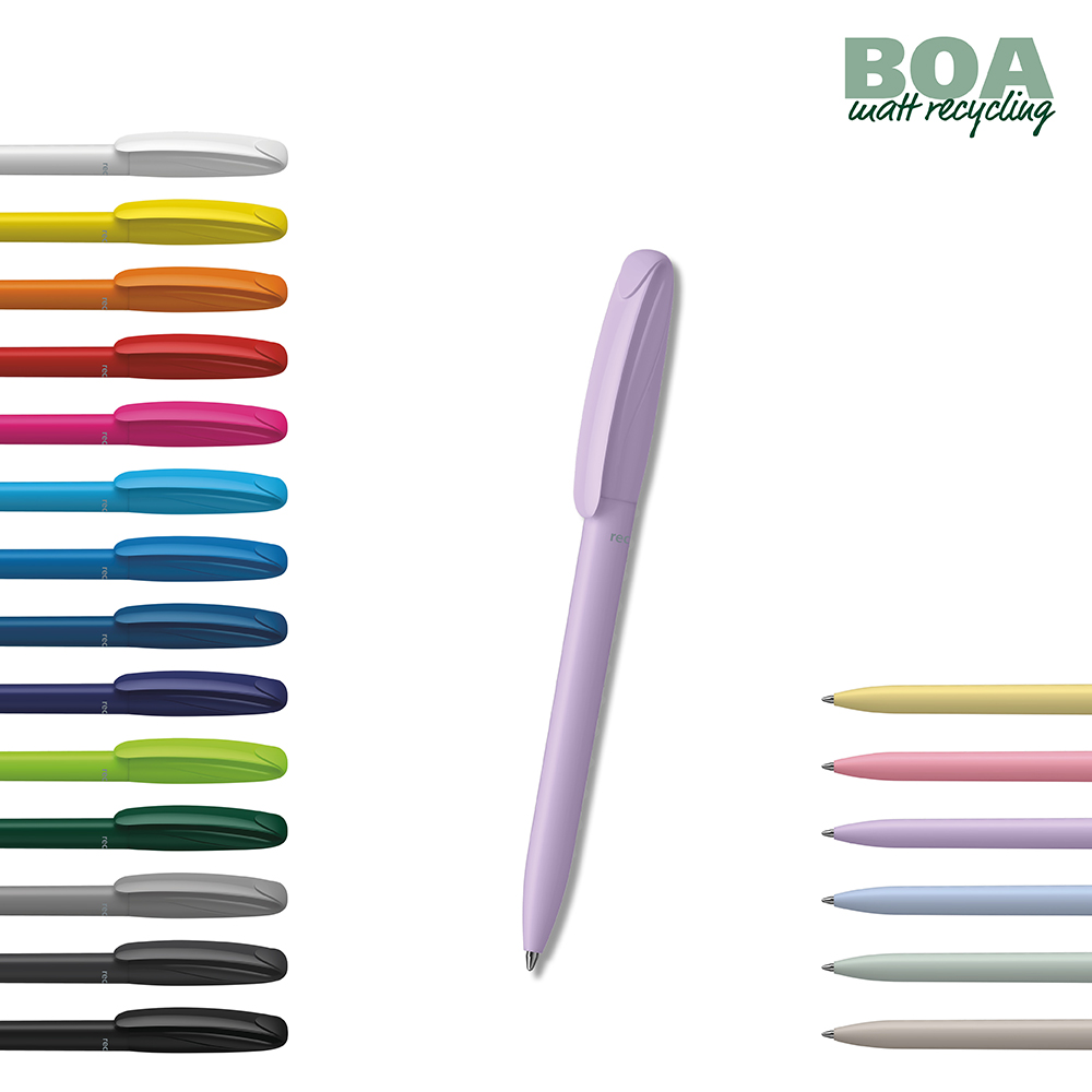 De Boa matt recycling is een Draaibalpen. Materialen en oppervlakken: Schacht en bovendeel: Kunststof (rABS) mat, gerecycled. Bovendeel: Mix van matte en glanzende oppervlakken. Navulbuis: Gerecycled polypropyleen (rPP). Standaard kleuren: Schacht en bovendeel: te combineren uit 20 kleuren. Opmerking: Doordat gebruik wordt gemaakt van gerecyclede grondstoffen, kunnen zelfs in afzonderlijke onderdelen van een product kleurafwijkingen voorkomen. : vanaf 3000 stuks; vanaf 25.000 stuks zonder PMS-toeslag. Standaard vulling: Silktech L (3 000 m), blauw of zwart, vulling optioneel: Silktech XL, Multifill P, Multi-Gel.