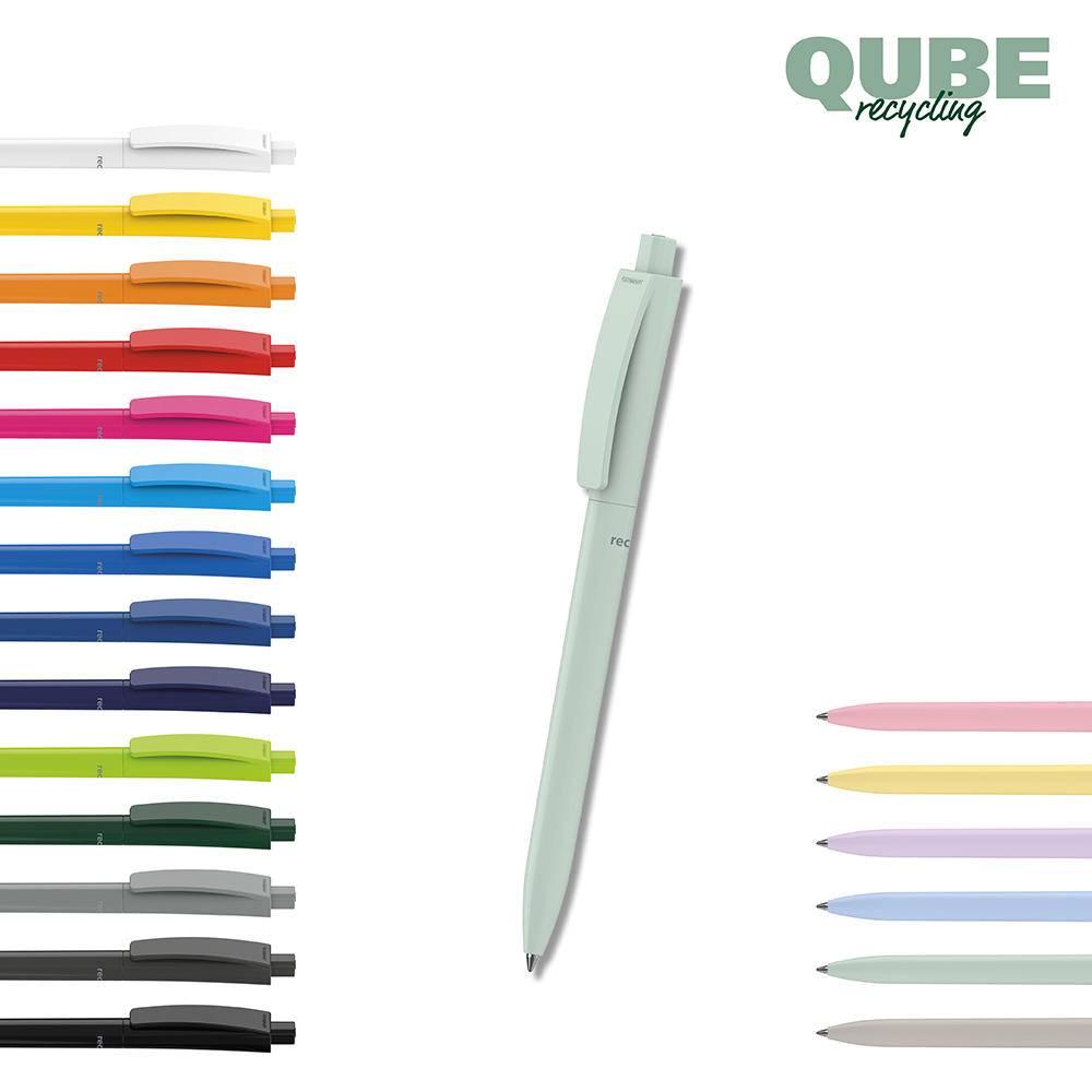 De Qube recycling is een Drukknop-balpen. Materialen en oppervlakken: Schacht, bovendeel en drukknop: Kunststof (rABS) hoogglanzend, gerecycled. Navulbuis: Gerecycled polypropyleen (rPP). Standaard kleuren: Schacht, bovendeel en drukknop: te combineren uit 20 kleuren. Opmerking: Doordat gebruik wordt gemaakt van gerecyclede grondstoffen, kunnen zelfs in afzonderlijke onderdelen van een product kleurafwijkingen voorkomen. : vanaf 5000 stuks; vanaf 25.000 stuks zonder PMS-toeslag. Standaard vulling: Silktech L (3 000 m), blauw of zwart, vulling optioneel: Silktech XL, Multifill P, Multi-Gel.