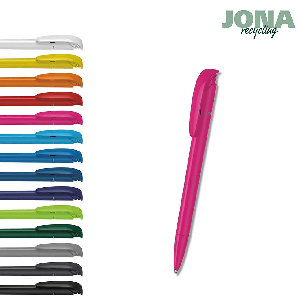 De Jona recycling is een Drukknop-balpen. Materialen en oppervlakken: Punt, schacht en drukknopclip: Kunststof (rABS) hoogglanzend, gerecycled. Navulbuis: Gerecycled polypropyleen (rPP). Standaard kleuren: Punt, schacht en drukknopclip: te combineren uit 14 kleuren. Opmerking: Doordat gebruik wordt gemaakt van gerecyclede grondstoffen, kunnen zelfs in afzonderlijke onderdelen van een product kleurafwijkingen voorkomen. : vanaf 3000 stuks; vanaf 25.000 stuks zonder PMS-toeslag. Standaard vulling: Silktech L (3 000 m), blauw of zwart, vulling optioneel: Silktech XL, Multifill P, Multi-Gel.