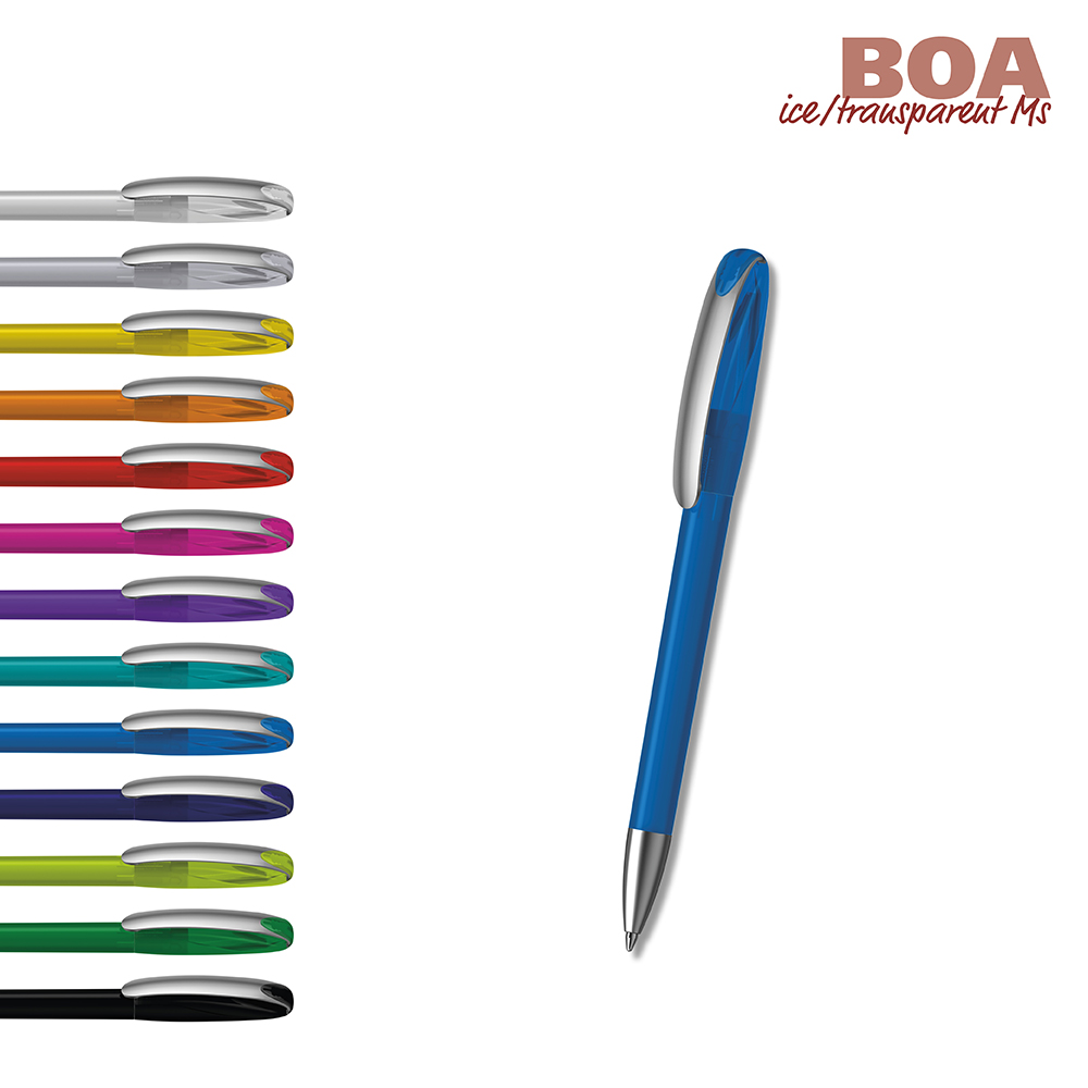 De Boa ice/transparent Ms is een Draaibalpen. Materialen en oppervlakken: Punt: Messing matverchroomd. Schacht en bovendeel: Kunststof (M-ABS) gematteerd, Bovendeel: Mix van matte en glanzende oppervlakken. Navulbuis: Gerecycled polypropyleen (rPP). Standaard kleuren: Schacht en bovendeel: te combineren uit 12 kleuren. : vanaf 5000 stuks; vanaf 25.000 stuks zonder PMS-toeslag. Standaard vulling: Silktech L (3 000 m), blauw of zwart, vulling optioneel: Silktech XL, Multifill P, Multi-Gel.