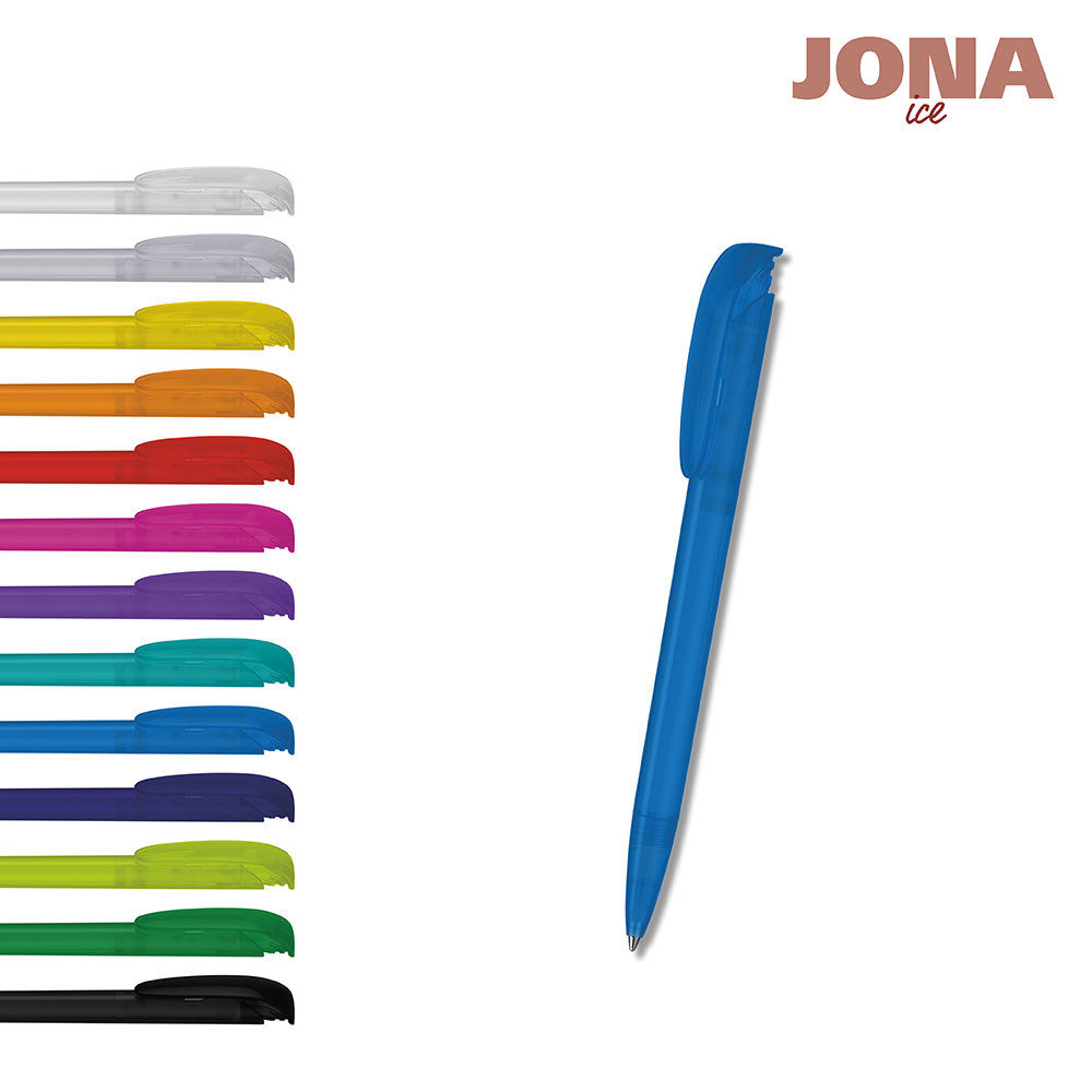 De Jona ice is een Drukknop-balpen. Materialen en oppervlakken: Punt, schacht en drukknopclip: Kunststof (M-ABS) gematteerd. Navulbuis: Gerecycled polypropyleen (rPP). Standaard kleuren: Punt, schacht en drukknopclip: te combineren uit 12 kleuren. : vanaf 5000 stuks; vanaf 25.000 stuks zonder PMS-toeslag. Standaard vulling: Silktech L (3 000 m), blauw of zwart, vulling optioneel: Silktech XL, Multifill P, Multi-Gel.