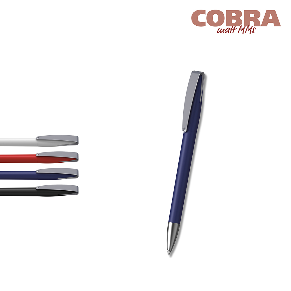 De Cobra matt MMs is een Draaibalpen. Materialen en oppervlakken: Punt: Messing matverchroomd. Schacht en bovendeel: Kunststof (ABS) mat. Clip: Verenstaal matverchroomd. Navulbuis: Gerecycled polypropyleen (rPP). Standaard kleuren: Schacht en bovendeel: te combineren uit 4 kleuren. : vanaf 5000 stuks; vanaf 25.000 stuks zonder PMS-toeslag. Standaard vulling: Silktech L (3 000 m), blauw of zwart, vulling optioneel: Silktech XL, Multifill P, Multi-Gel.