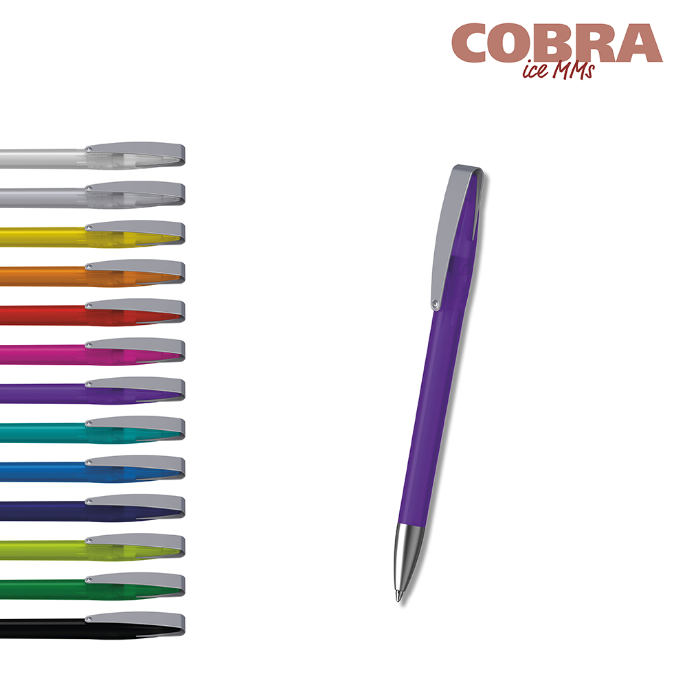 De Cobra ice MMs is een Draaibalpen. Materialen en oppervlakken: Punt: Messing matverchroomd. Schacht en bovendeel: Kunststof (M-ABS) gematteerd. Clip: Verenstaal matverchroomd. Navulbuis: Gerecycled polypropyleen (rPP). Standaard kleuren: Schacht en bovendeel: te combineren uit 12 kleuren. : vanaf 5000 stuks; vanaf 25.000 stuks zonder PMS-toeslag. Standaard vulling: Silktech L (3 000 m), blauw of zwart, vulling optioneel: Silktech XL, Multifill P, Multi-Gel.