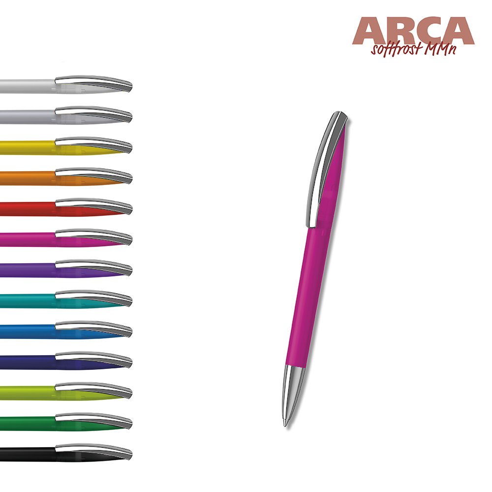 De Arca softfrost MMn is een Draaibalpen. Materialen en oppervlakken: Punt: Messing vernikkeld. Schacht en bovendeel: Kunststof (M-ABS) transparant, met rubber bekleed softfrost oppervlak. Clip: Verenstaal vernikkeld. Navulbuis: Gerecycled polypropyleen (rPP). Standaard kleuren: Schacht en bovendeel: te combineren uit 12 kleuren. : vanaf 5000 stuks; vanaf 25.000 stuks zonder PMS-toeslag. Standaard vulling: Silktech L (3 000 m), blauw of zwart, vulling optioneel: Silktech XL, Multifill P, Multi-Gel.