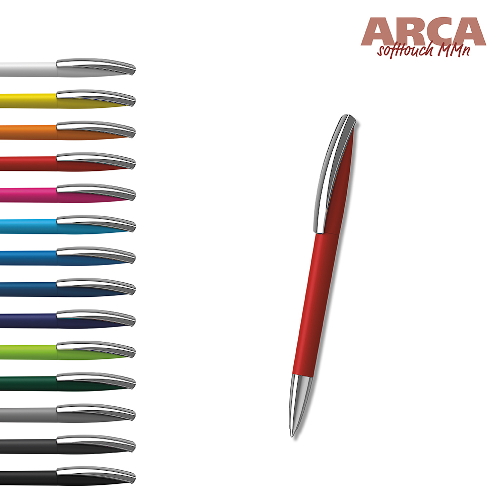De Arca softtouch MMn is een Draaibalpen. Materialen en oppervlakken: Punt: Messing vernikkeld. Schacht en bovendeel: Kunststof (ABS), rubber softtouch oppervlak. Clip: Verenstaal vernikkeld. Navulbuis: Gerecycled polypropyleen (rPP). Standaard kleuren: Schacht en bovendeel: te combineren uit 14 kleuren. : vanaf 5000 stuks; vanaf 25.000 stuks zonder PMS-toeslag. Standaard vulling: Silktech L (3 000 m), blauw of zwart, vulling optioneel: Silktech XL, Multifill P, Multi-Gel.