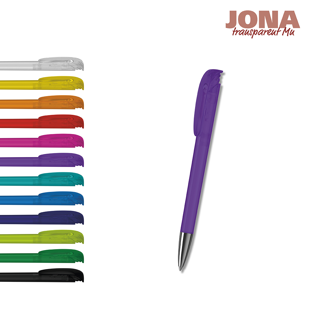 De Jona transparent Mn is een Drukknop-balpen. Materialen en oppervlakken: Punt: Messing vernikkeld. Schacht en drukknopclip: Kunststof (M-ABS) transparant. Navulbuis: Gerecycled polypropyleen (rPP). Standaard kleuren: Schacht en drukknopclip: te combineren uit 12 kleuren. : vanaf 5000 stuks; vanaf 25.000 stuks zonder PMS-toeslag. Standaard vulling: Silktech L (3 000 m), blauw of zwart, vulling optioneel: Silktech XL, Multifill P, Multi-Gel.