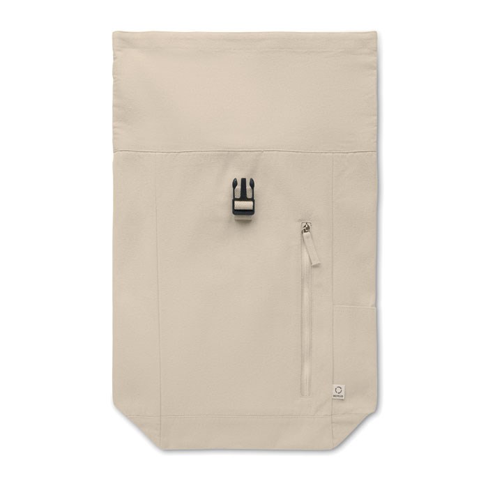 Rolltop rugzak met klittenbandsluiting in 390gr/m² gerecycled katoen (80%) en gerecycled polyester (20%). Voorzak met ritssluiting.