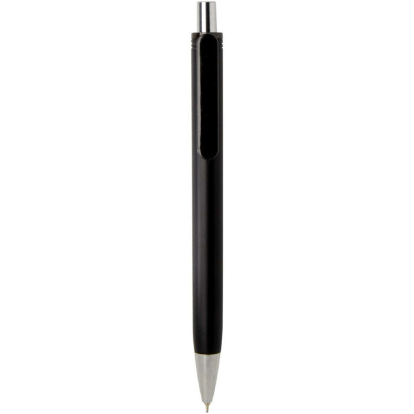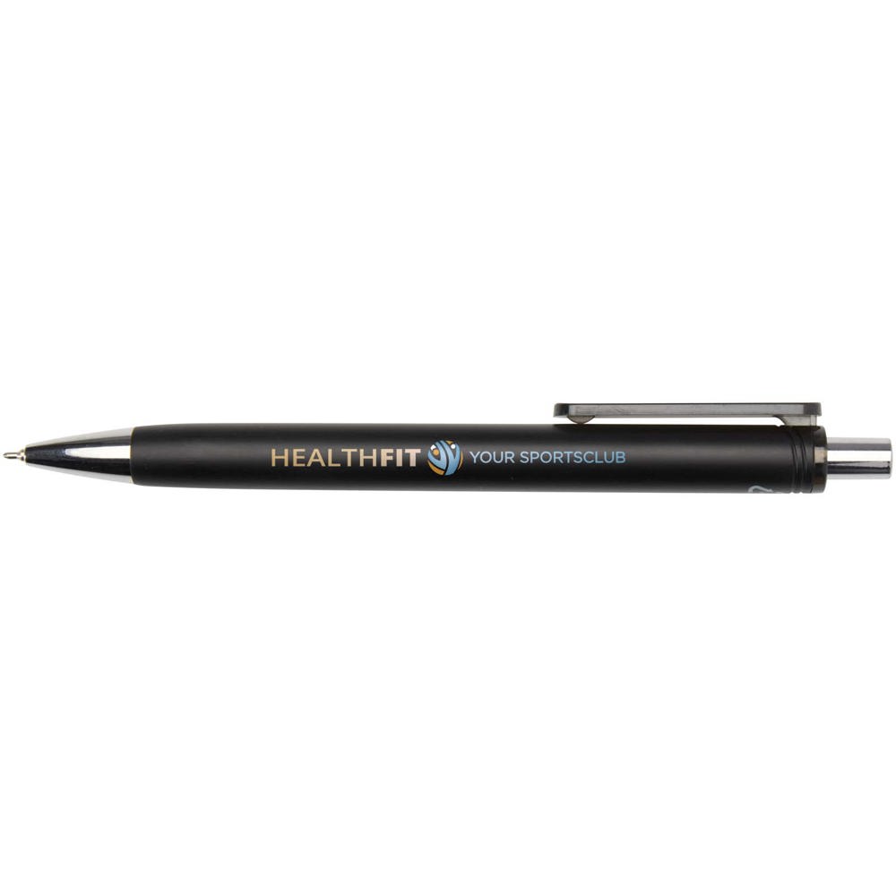 De Feld balpen met metallic afwerking combineert dagelijks gebruiksgemak met een strak design. Gemaakt van RCS-gecertificeerd gerecycled ABS-plastic en voorzien van een glanzende metaallook met gepolijste chroomaccenten. De soepele drukmechaniek en semi-gelvulling zorgen voor een prettige schrijfervaring. Inktkleur: zwart. Schrijflengte: 500 m. Puntgrootte: 0,7 mm.