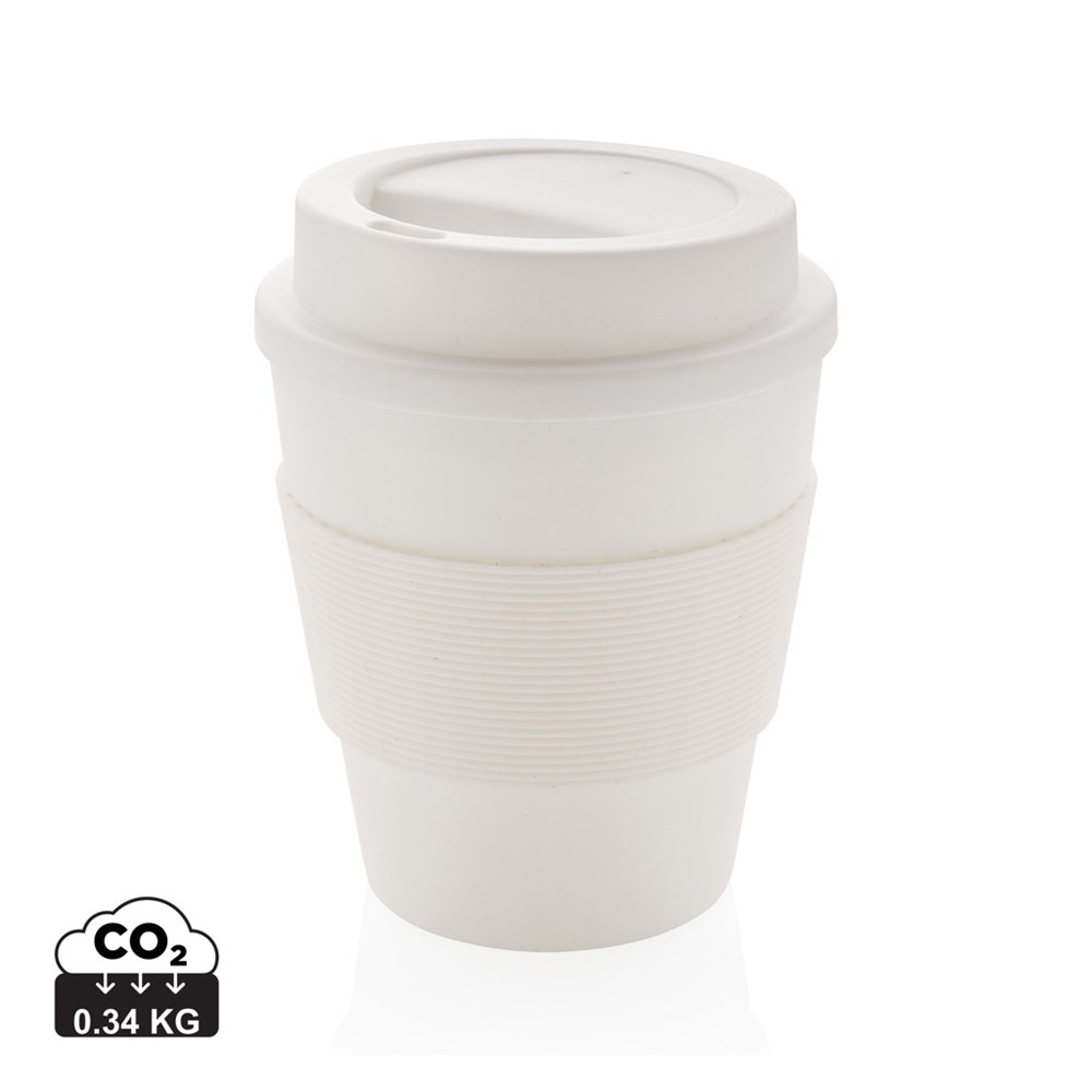 Mug 350ml en PP recyclable, couvercle à vis et bandeau de protection en silicone. Convient pour...plus