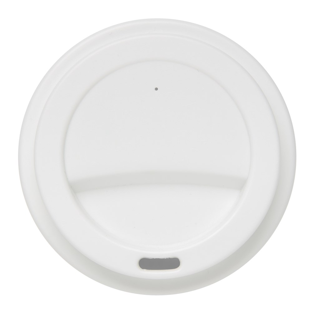 Mug 350ml en PP recyclable, couvercle à vis et bandeau de protection en silicone. Convient pour les boissons froides et les boissons chaudes jusqu'à 100 degrés.