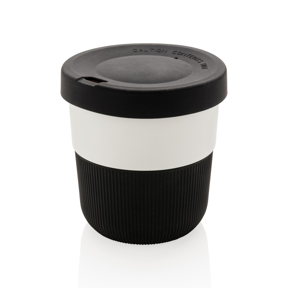 Mug 280ml avec partie blanche en PLA (100% de matériel végétal). Couvercle et bandeau de protection en silicone. Taille compacte idéale pour être placé sous la machine à café. 100% sans mélamine.