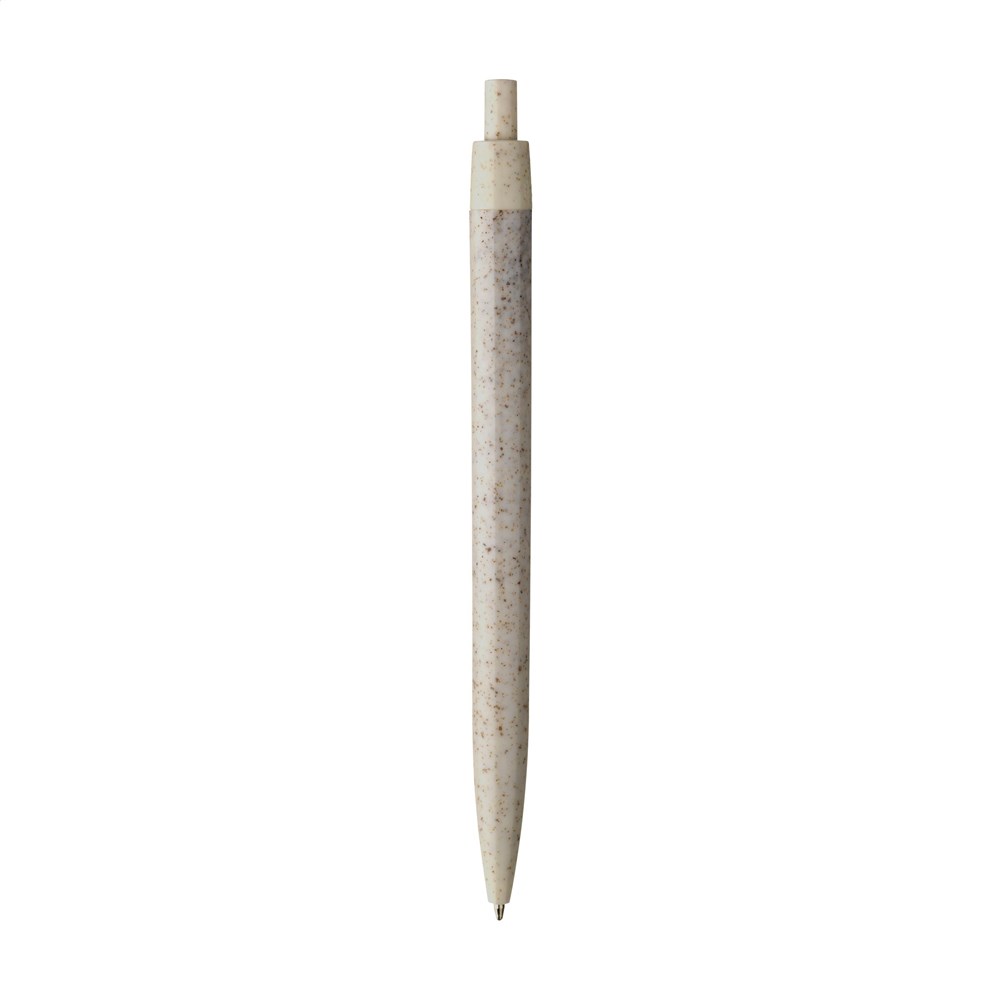 Stylo à bille bleu fabriqué à 60 % en paille de blé et 40 % en plastique. Le support, le clip et le bouton poussoir sont dans le même matériau et tout le stylo est exécuté avec style en une seule couleur.