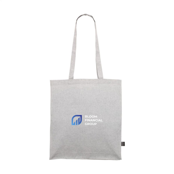 Sac cabas robuste à longues anses en 80% coton recyclé et 20% polyester recyclé (150 g/m²). Certifiée GRS. Matière recyclée totale : 100%. Capacité env. 12 litres.