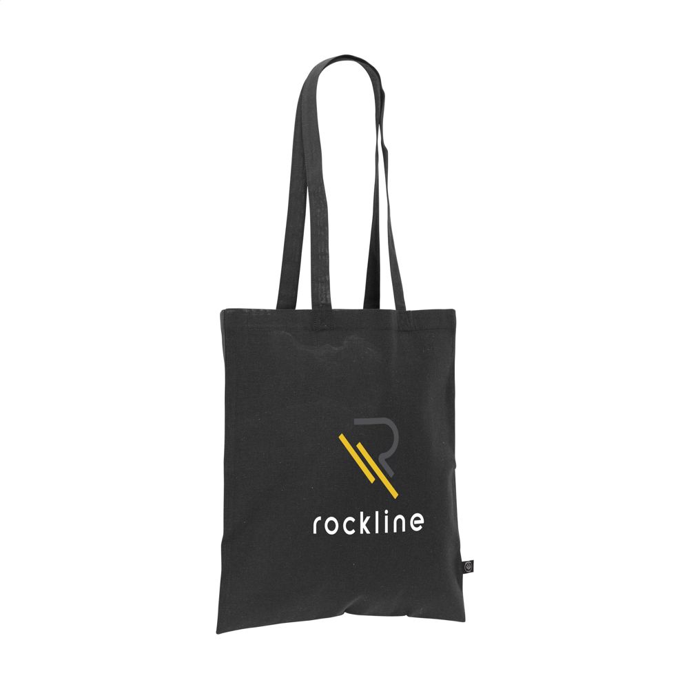 Sac cabas à longues anses en 80% coton recyclé et 20% polyester recyclé (150 g/m²). Certifiée-GRS. Matière recyclée totale : 100%. Capacité env. 8 litres.