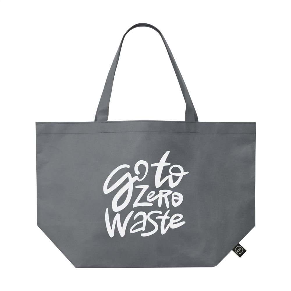 Grand sac de shopping et de plage en matière RPET non-tissée (80 g/m²), fabrique à partir de bouteilles en PET recyclées. Un sac grand format, à la fois solide et léger avec de longues anses. Certifiée-GRS. Matière recyclée totale : 98%. Capacité env. 25 litres.