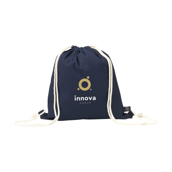Sac à dos à cordon en 80% coton recyclé et 20% polyester recyclé (150 g/m²). Certifiée GRS. Matière recyclée totale : 100%. Capacité env. 7 litres.