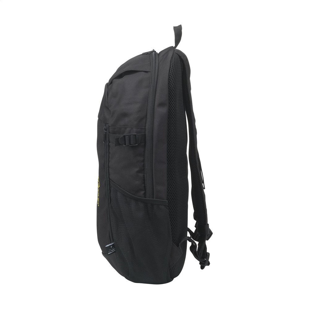 Sac à dos en polyester RPET robuste. Un design fin avec un compartiment généreux permettant de transporter en toute sécurité un ordinateur portable jusqu'à 15,6 pouces. Il est doté d'une poche zippée supplémentaire sur le devant et d'une poche en filet sur les deux côtés. Les bretelles réglables et le panneau arrière sont doublés d'un tissu en maille et dotés de mousse pour un meilleur confort de transport. Les sangles d'épaule réglables sont dotées de boucles supplémentaires et d'une sangle pour les maintenir en place pendant le transport. Ce sac à dos est doté de fermetures éclair robustes, entièrement doublé et soigneusement fini. Un sac à dos compact qui offre un espace surprenant. Certifié GRS. Total des matériaux recyclés : 92%. Capacité d'environ 12 litres.