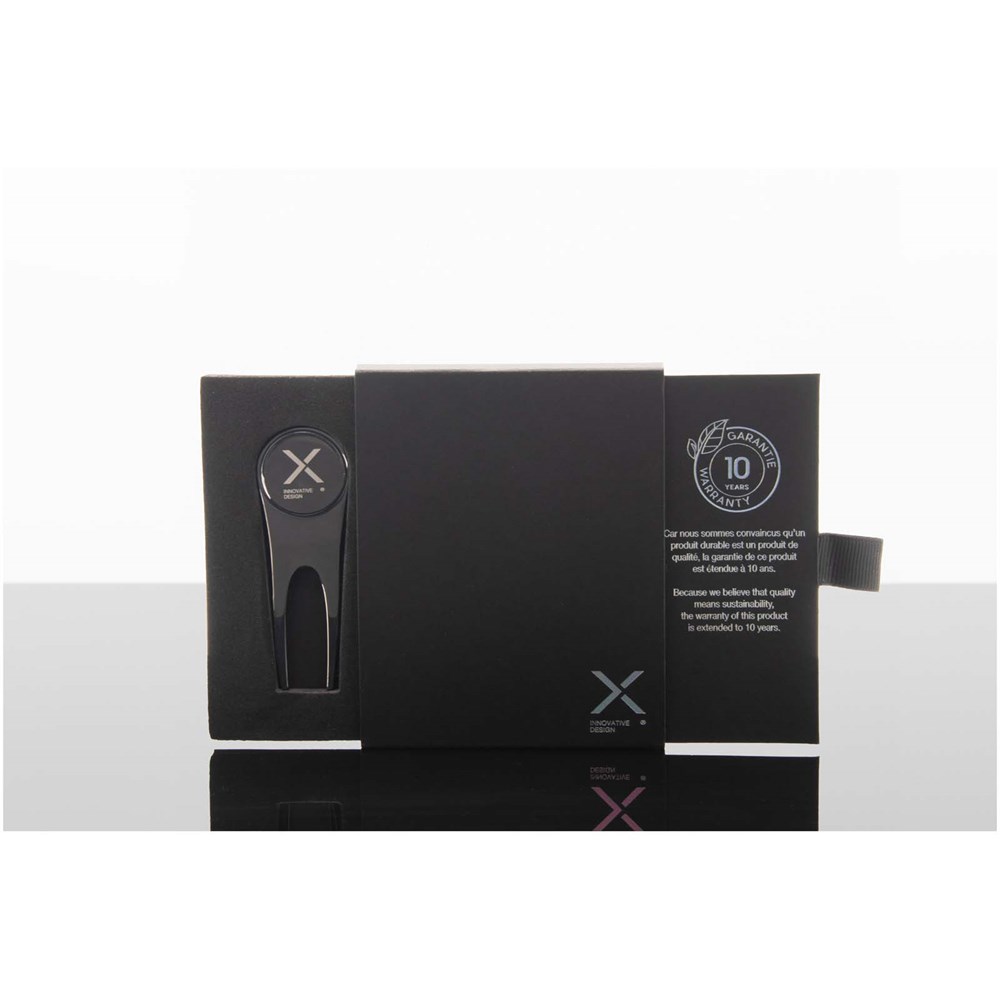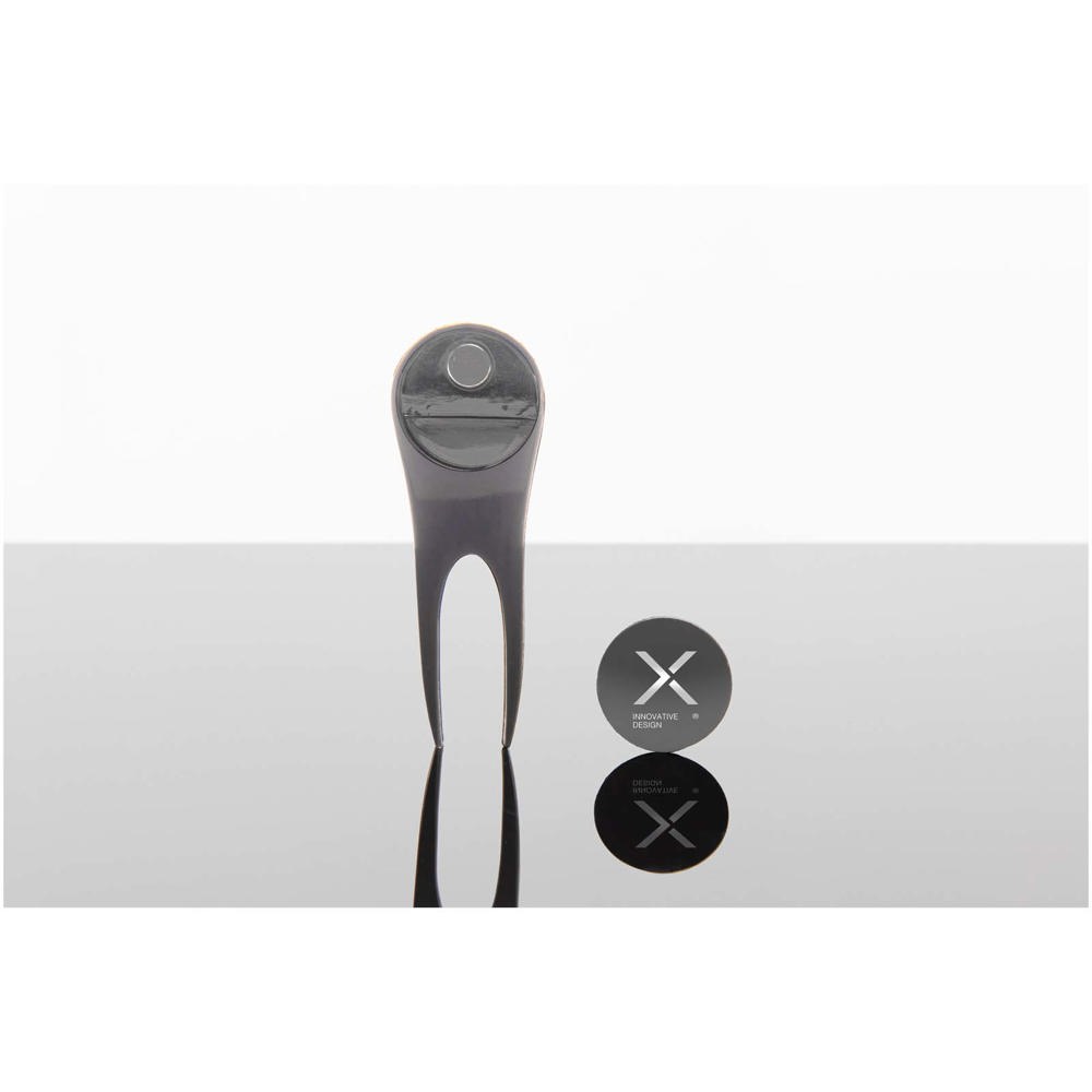 Dit golfaccessoire combineert een pitchfork van zinklegering met een magnetische balmarker om de golfbal moeiteloos te volgen. Gepresenteerd in een gerecyclede kartonnen geschenkverpakking. Afmetingen: 8 x 2,5 cm.