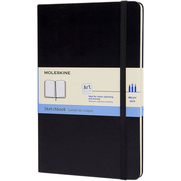 Le grand carnet de croquis d’art Moleskine est relié en carton, avec une couverture arrondie, et contient du papier sans acide de qualité supérieure. Le carnet de croquis est doté d’un marque-page, d’une fermeture élastique et d’une pochette intérieure extensible contenant un texte qui raconte l’histoire de Moleskine.
