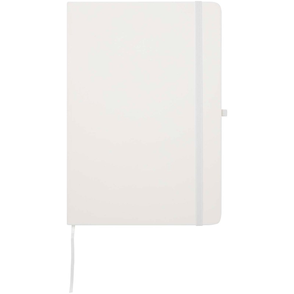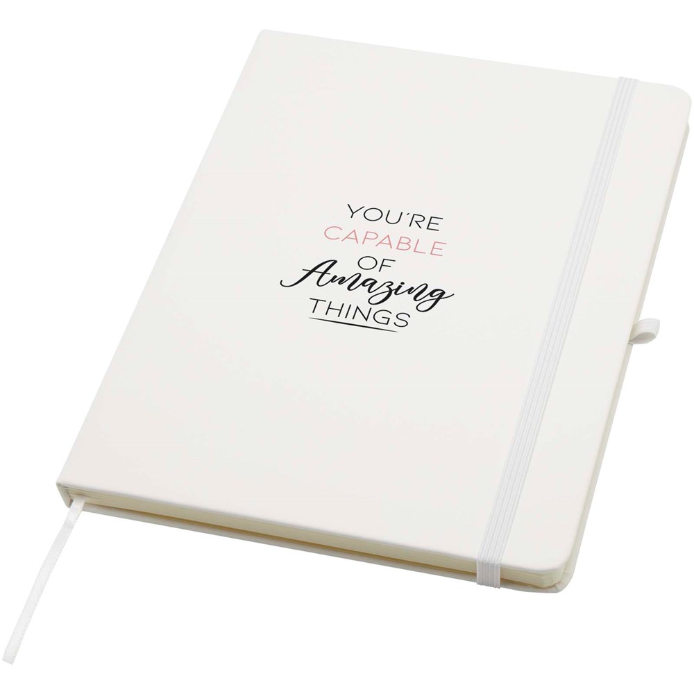 Le carnet à couverture rigide Spectrum Plus A5 à coins arrondis constitue non seulement un accessoire de bureau indispensable, mais aussi une excellente occasion de promouvoir votre marque. Ce carnet est pourvu d’une couverture douce et de 80 feuilles lignées de couleur crème de 70 g/m², idéales pour noter les pensées qui vous passent par la tête, comme du texte plus long. Ce carnet est doté d’une boucle pour stylo, d’une fermeture élastique, d’un ruban marque-page et d’une pochette en accordéon.