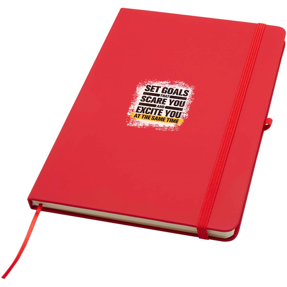 Le carnet à couverture rigide Spectrum Plus A5 à coins arrondis constitue non seulement un accessoire de bureau indispensable, mais aussi une excellente occasion de promouvoir votre marque. Ce carnet est pourvu d’une couverture douce et de 80 feuilles lignées de couleur crème de 70 g/m², idéales pour noter les pensées qui vous passent par la tête, comme du texte plus long. Ce carnet est doté d’une boucle pour stylo, d’une fermeture élastique, d’un ruban marque-page et d’une pochette en accordéon.