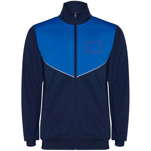 Survêtement en tissu léger et élastique. Veste avec couleur contrastée et finitions cousues sur la poitrine. Col montant avec coutures contrastées. Fermeture à glissière centrale sur le devant. Poches latérales. Poignets et taille côtelés 2x2. Pantalon avec ceinture élastique et cordon de serrage. Pièce latérale contrastée avec finition cousue. Ourlet zippé.