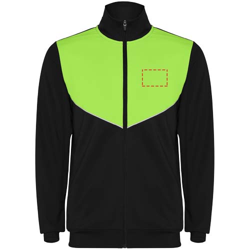 Survêtement en tissu léger et élastique. Veste avec couleur contrastée et finitions cousues sur la poitrine. Col montant avec coutures contrastées. Fermeture à glissière centrale sur le devant. Poches latérales. Poignets et taille côtelés 2x2. Pantalon avec ceinture élastique et cordon de serrage. Pièce latérale contrastée avec finition cousue. Ourlet zippé.
