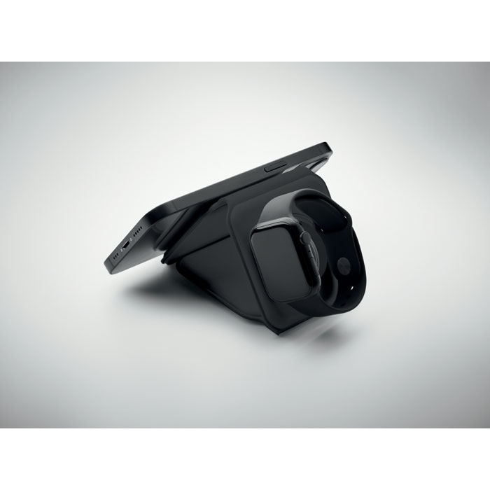 Station de charge pliable 3 en 1 en ABS. Elle dispose de 3 points de charge sans fil. Entrée : 2-en-1 Type-C et Type-A.
