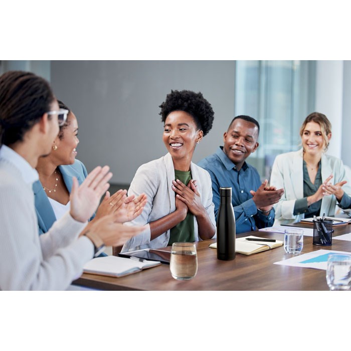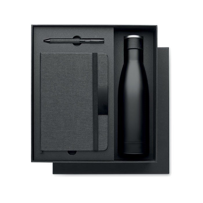 Coffret de luxe 3 pièces. Comprend un carnet A5 avec couverture rigide en RPET. 160 pages lignées en papier recyclé (80 feuilles). Fermeture élastique assortie, ruban marque-page et porte-stylo. Stylo à bille twist assorti. Bouteille en acier inox à double paroi. Capacité : 500 ml. Présentée dans coffret. FSC®-certified | FSC MIX CREDIT, P7.1, FSC-C213206