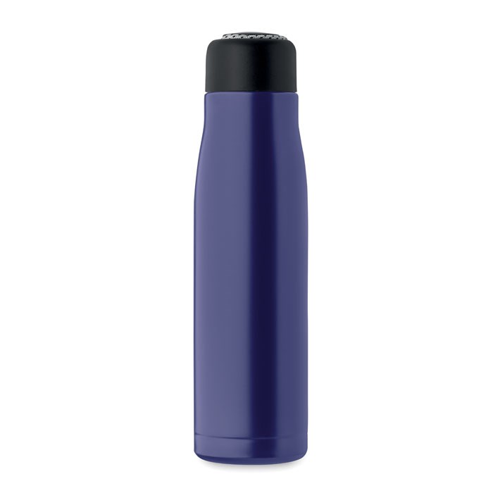 Bouteille à double paroi en acier inoxydable recyclé (90 % d'acier inoxydable recyclé et 10 % d'acier inoxydable) avec poignée en corde insérée dans le bouchon en PP. Anti fuite. Capacité : 500 ml.
