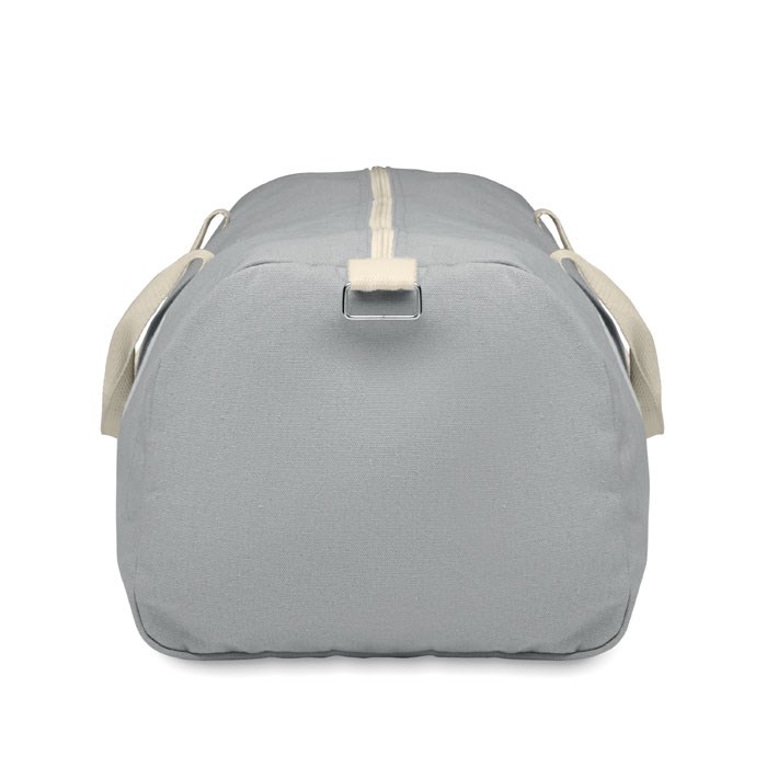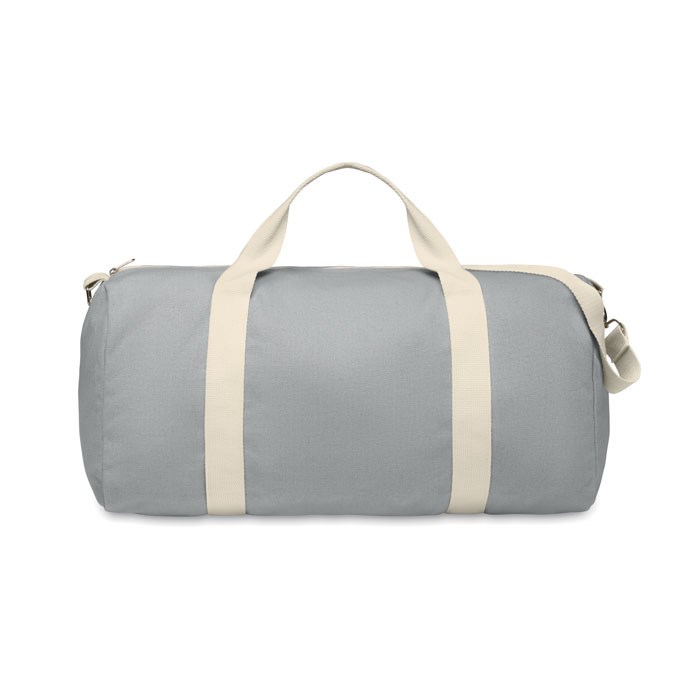 Sac de sport en tissus recyclés (60% coton recyclé, 40% polyester recyclé) en 320 gr/m² avec poignée en sangle de coton naturel et une bandoulière réglable et amovible.