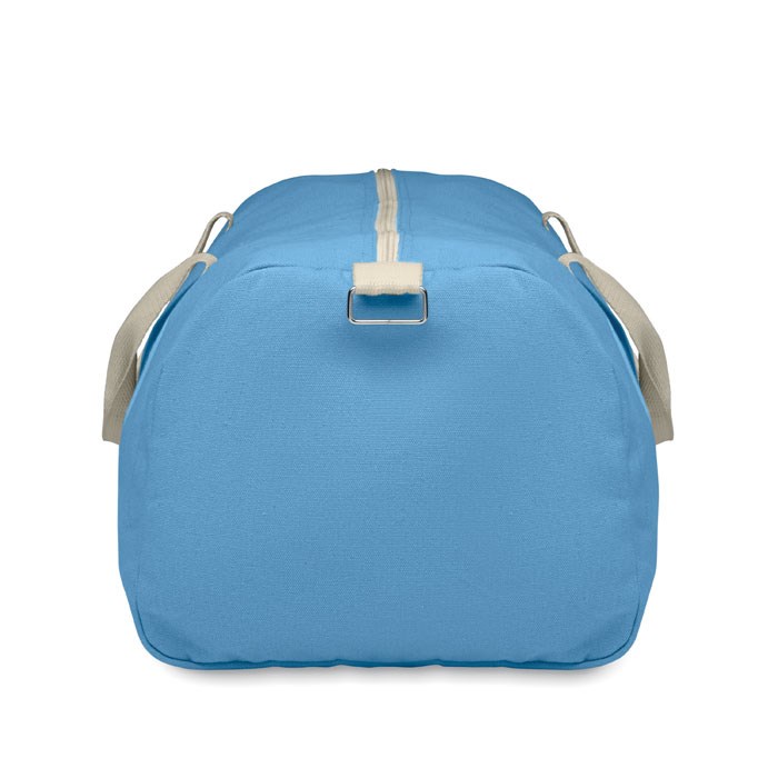 Sac de sport en tissus recyclés (60% coton recyclé, 40% polyester recyclé) en 320 gr/m² avec poignée en sangle de coton naturel et une bandoulière réglable et amovible.
