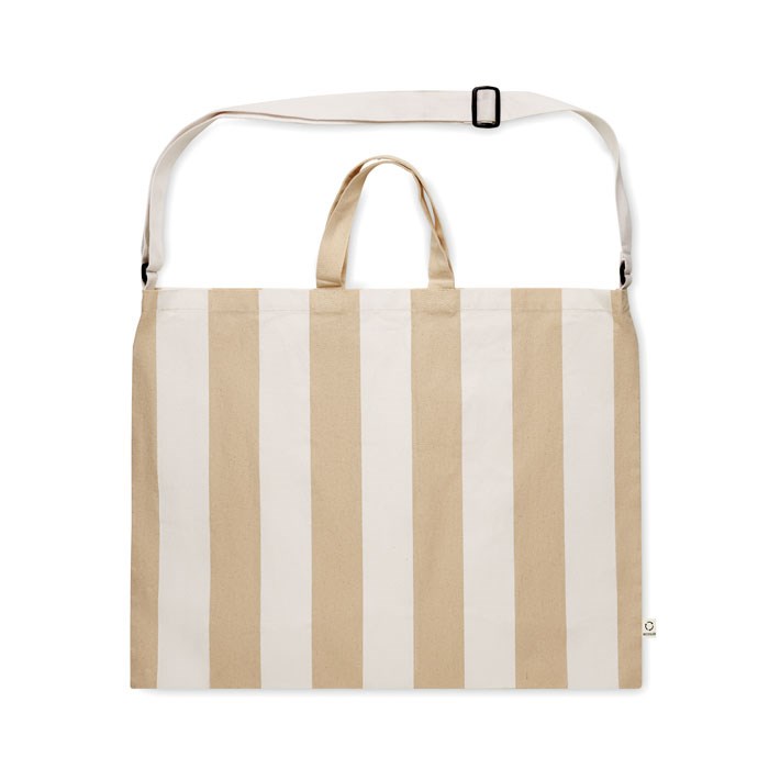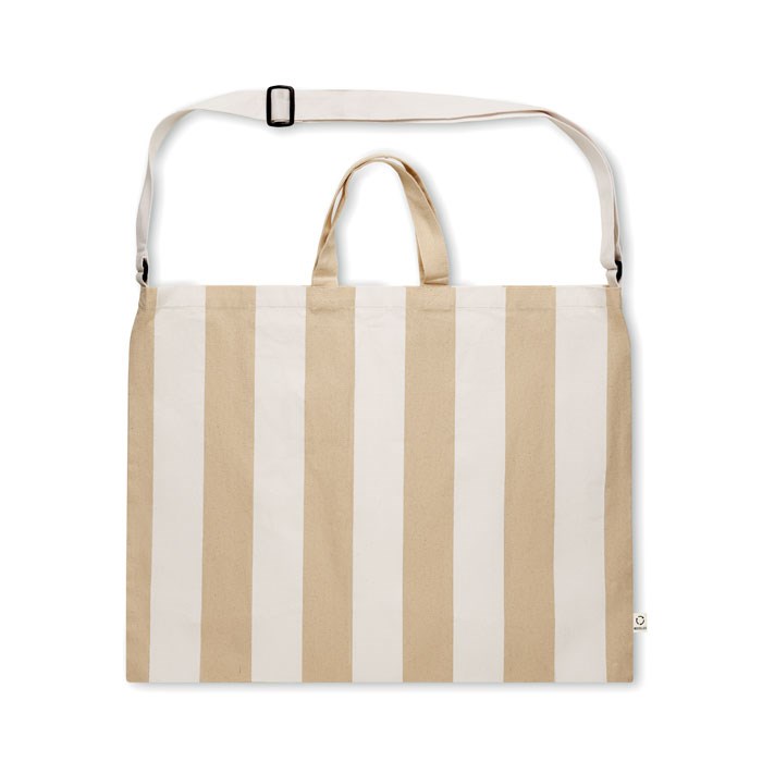 Très grand sac de plage rayé en coton recyclé (80%) et polyester recyclé (20%) de 280 gr/m² avec poche intérieure. Poignées courtes et une grande bandoulière réglable.