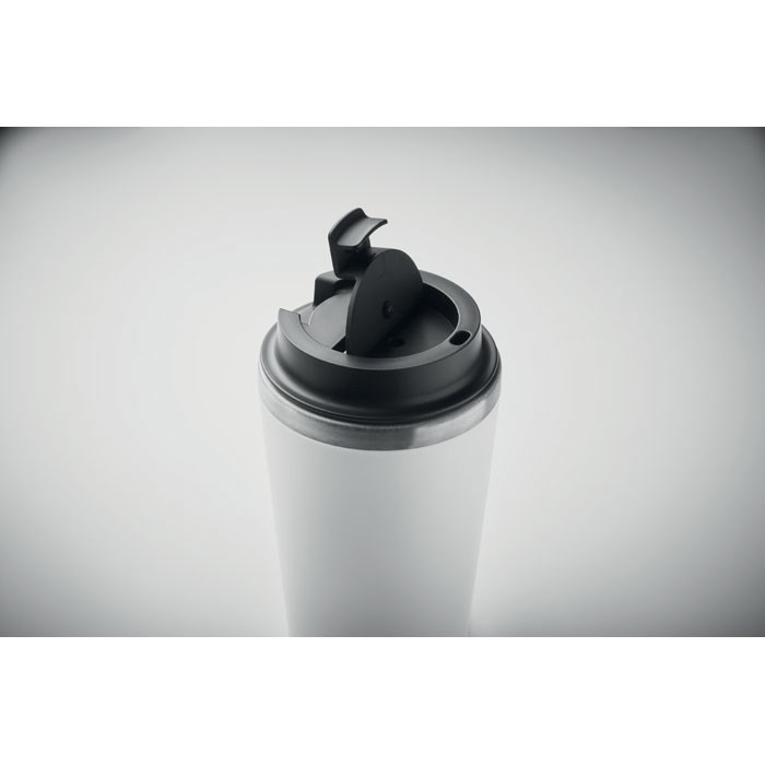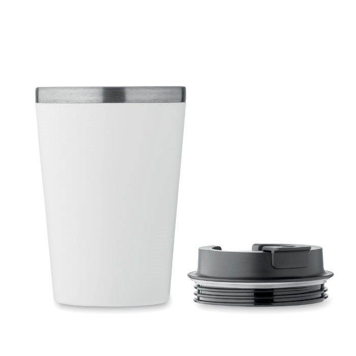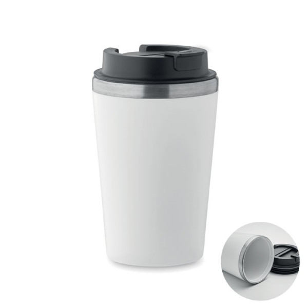 Gobelet à double paroi Paroi extérieure en PP et paroi intérieure en acier inoxydable recyclé (90 % d'acier inoxydable recyclé et 10 % d'acier inoxydable) et revêtement en céramique. Sans fuite. Capacité : 350 ml.