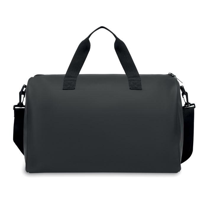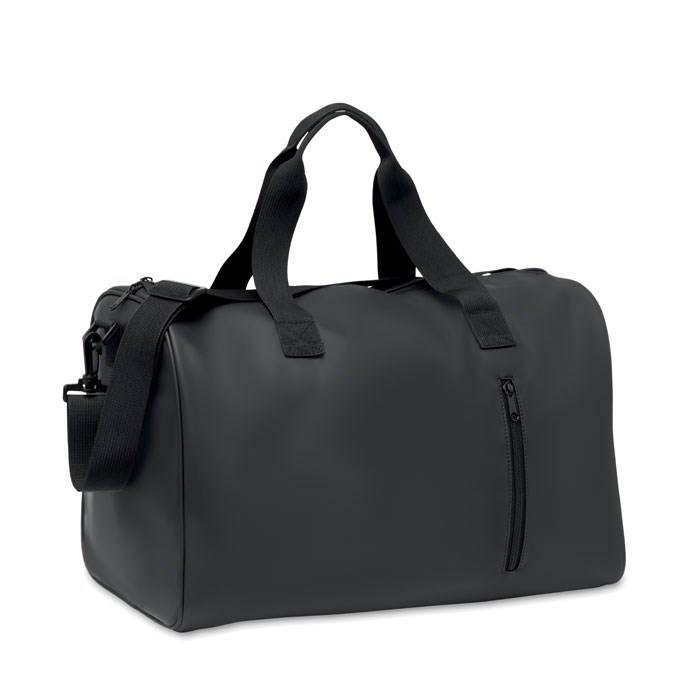 Sac de sport en PU souple avec renfort inférieur en mousse. Un compartiment principal, une poche frontale zippée. doublure en polyester 210D RPET. 2 poignées et une bandoulière réglable et amovible