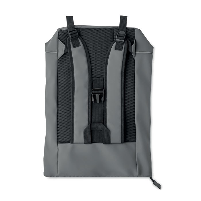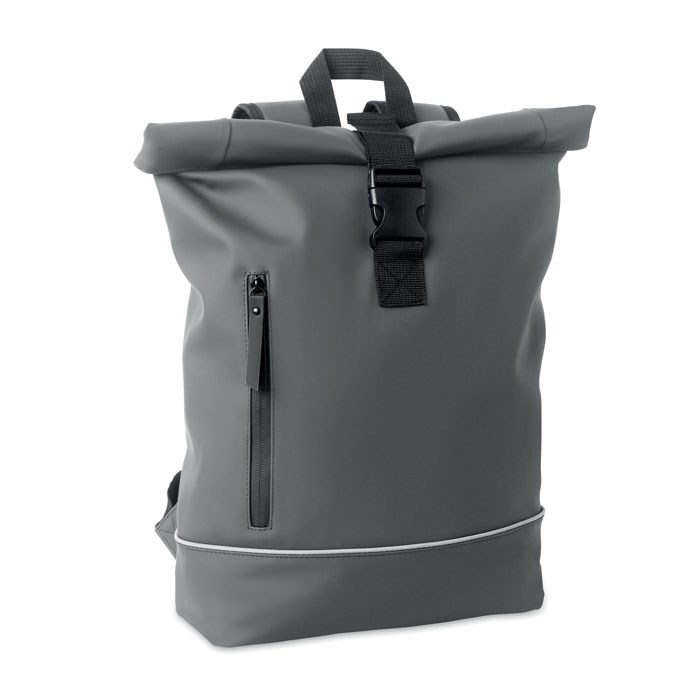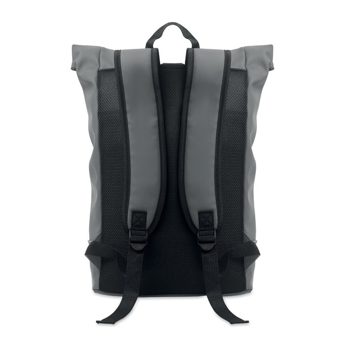 Sac à dos enroulable pour ordinateur portable 15 pouces en PU souple avec dos rembourré, base renforcée et bande réfléchissante. Poche frontale étanche avec fermeture éclair. doublure en polyester 210D RPET.