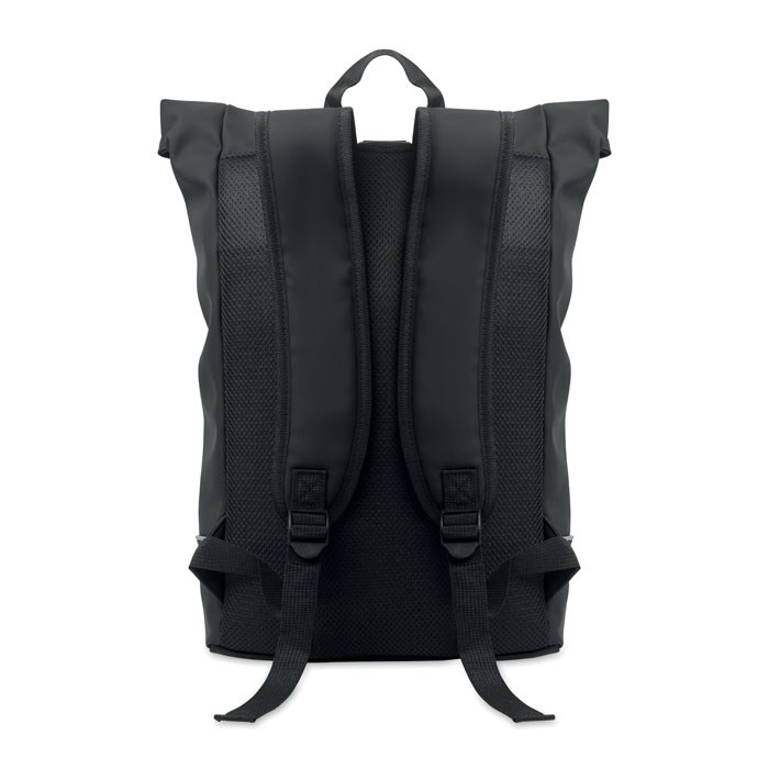 Sac à dos enroulable pour ordinateur portable 15 pouces en PU souple avec dos rembourré, base renforcée et bande réfléchissante. Poche frontale étanche avec fermeture éclair. doublure en polyester 210D RPET.