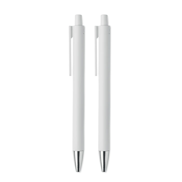 Parure de stylos en aluminium recyclé comprenant 1 stylo bille à poussoir (encre bleue) et 1 stylo graphite sans encre. Présentée dans une boîte en papier recyclé.