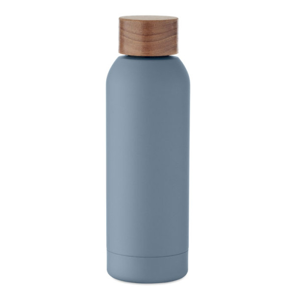 Bouteille à simple paroi en acier inoxydable recyclé à 90 % et acier inoxydable à 10 %, avec finition en caoutchouc et couvercle en bois d'acacia. Anti fuite. Capacité : 700 ml. Comme il s'agit d'une simple paroi, un transfert de chaleur peut encore se produire.