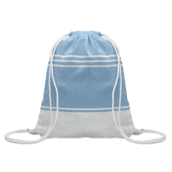 Fouta avec sac à cordon assorti. 70% coton recyclé et 30% polyester recyclé 180 gr/m². Fouta 90x160 cm.