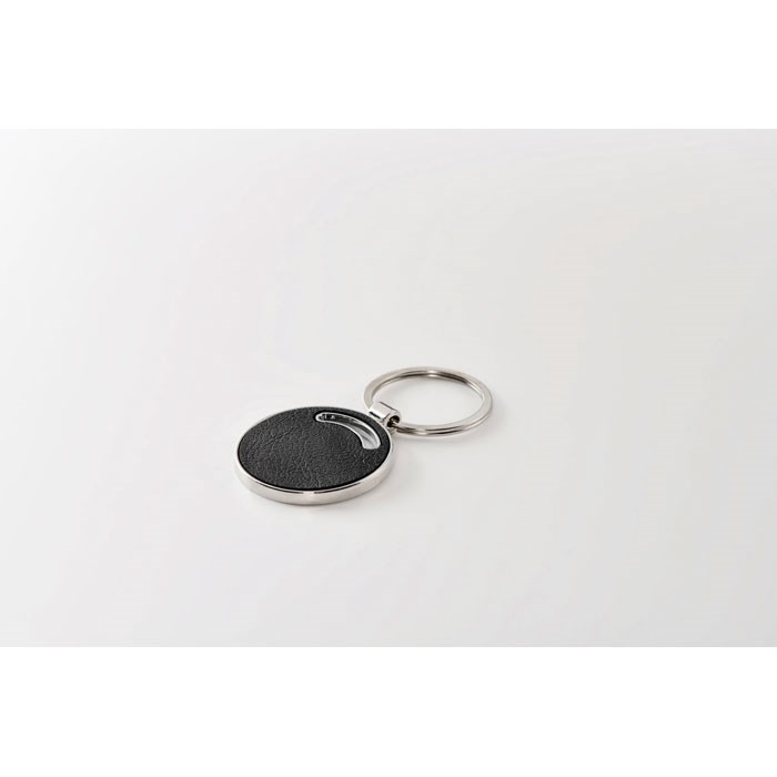 Porte-clés en métal de forme ronde avec incrustation en cuir PU recyclé.