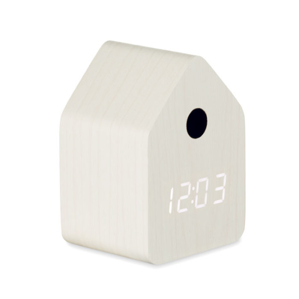 Horloge de bureau en MDF comprenant une alarme intégrée avec chant de coucou et affichage de température. L'oiseau chantera à chaque nouvelle heure et à l'horaire de l'alarme. Affichage LED blanc. Mode silence de 22.00h et 06.00h. Intervalles de répétition de 5 minutes