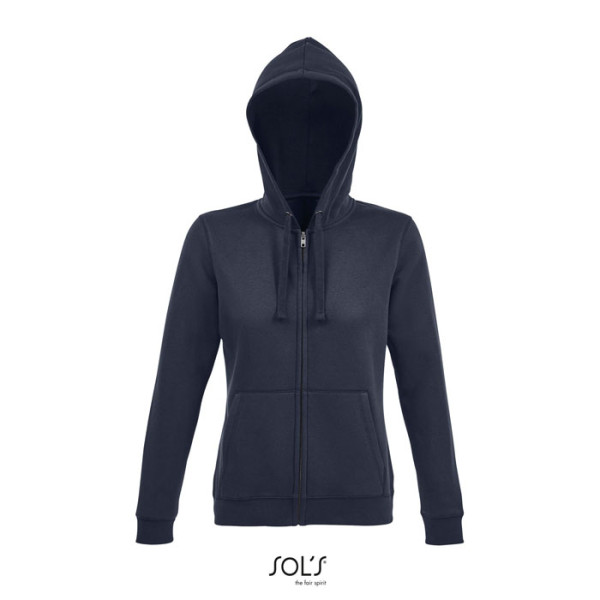SOL'S SPIKE WOMEN. Veste zippée homme à capuche, 80% coton Ring spun- 20% polyester. Intérieur grate, Extérieur 100% coton Molleton 280 technologie LSF (low shrinkage fabric) Manches montées, 2 poches kangourou, Coupé cousu, Capuche doublée avec cordon de serrage ton sur ton, Poignets et bas en bord côte 2x2, Demi-lune à l'intérieur du col, Bande de propreté intérieur col. Zip YKK. OEKO-TEX®. Vendu uniquement avec impression.