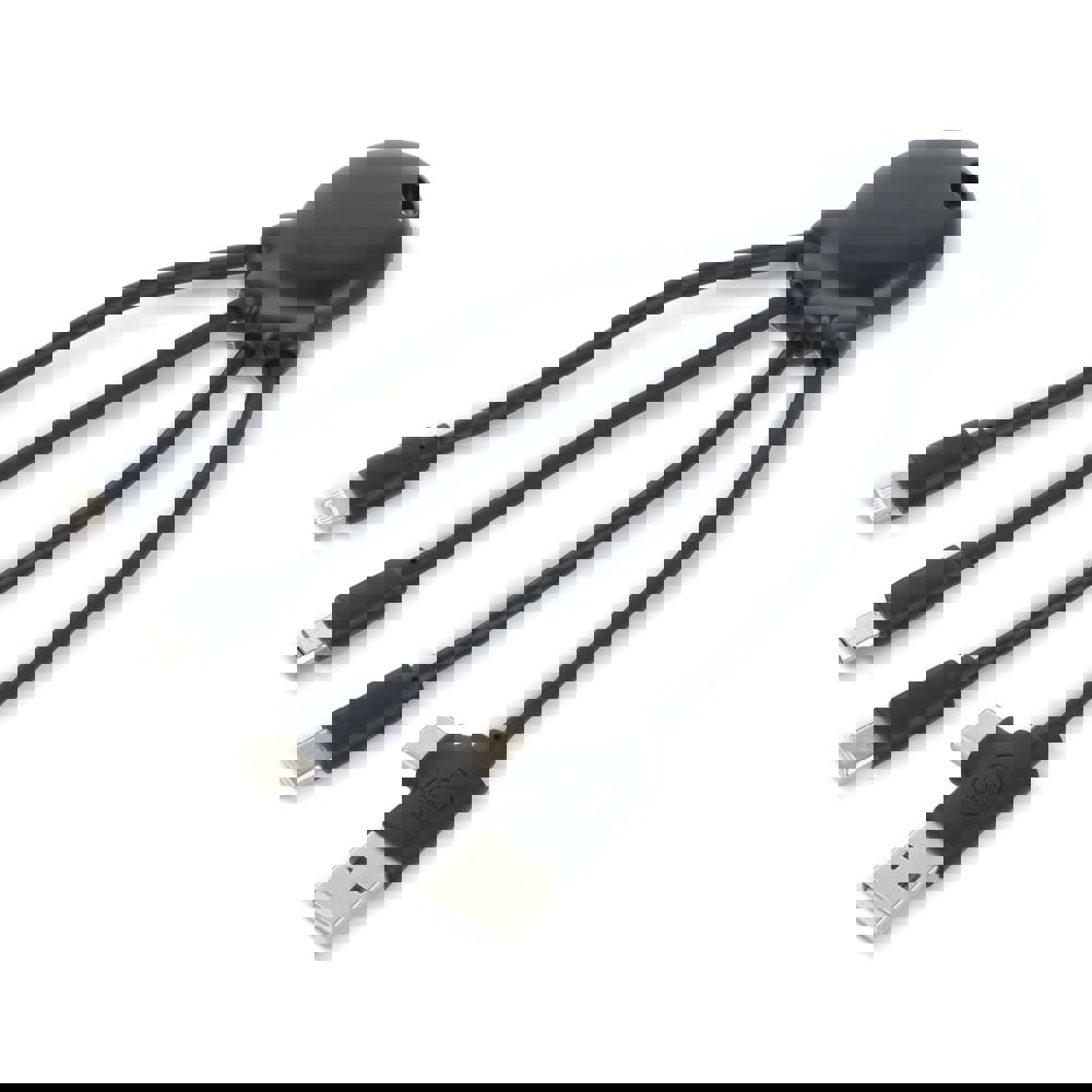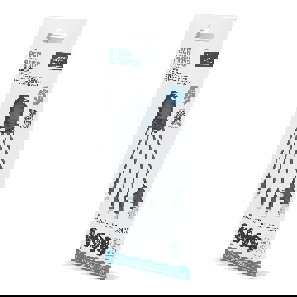 Le câble de charge Eco Octopus est fabriqué en plastique lié à l'océan. Avec deux entrées (USB-A et USB-C) et trois connecteurs différents, vous pouvez charger vos appareils de manière écologique. Au bureau, dans la voiture, dans votre sac ou en vacances ; ce câble de charge multiple est toujours utile !