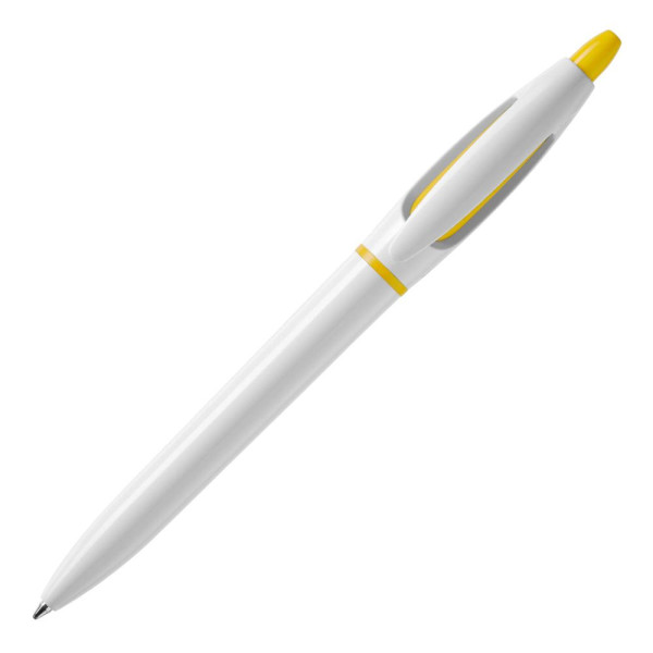 Le stylo bille S! de couleur opaque blanche avec poussoir et anneau colorés inclus une recharge d'écriture bleue X20. Sa cartouche X20 écrit jusqu’à 2.5kms, écriture par défaut bleue. Le stylo est fabriqué en Europe en plastique ABS. À partir de 5.000 pièces, vous pouvez choisir vos propres couleurs.